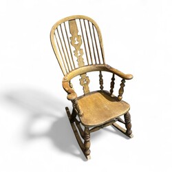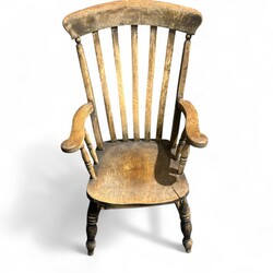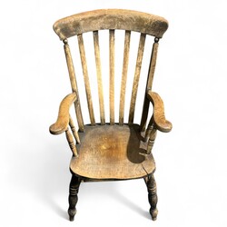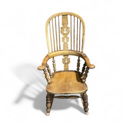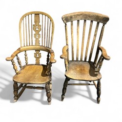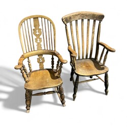 | Omschrijving | Lot van twee antieke 19e eeuwse Windsor stoelen, één fauteuil en één schommelstoel. Beide met hoge rugleuning en armleuningen. |