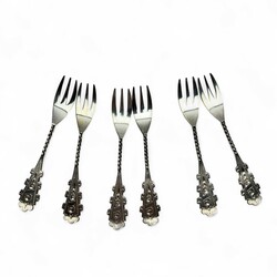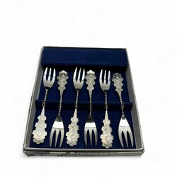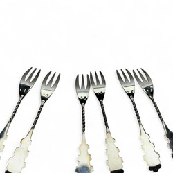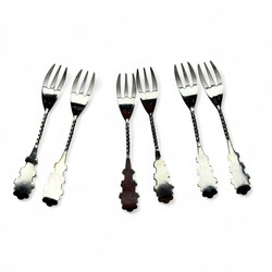 | Omschrijving | Lot van zes 20e eeuwse tweede gehalte (835/1000) zilveren gebaksvorkjes, model hanekam, met getorste steel. Mr. van der Meulen, Joure. |