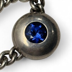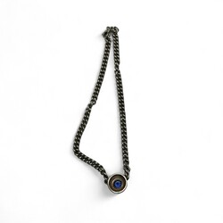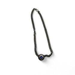 | Omschrijving | eerste gehalte zilveren ketting met zogenoemde ‘cuban chain’ schakels, met ronde hanger bezet met geslepen blauwe steen |