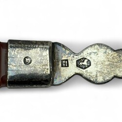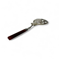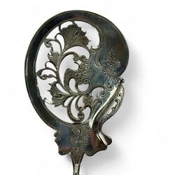 | Omschrijving | tweede gehalte zilveren natfruitschep met ajourgezaagde bak gedecoreerd en gegraveerd met sierlijke krulvormen, aan streepagaten heft, meester Willem Janszoon Kooiman, Schoonhoven, jaarletter 1883 |