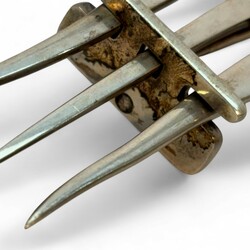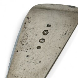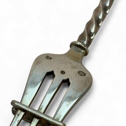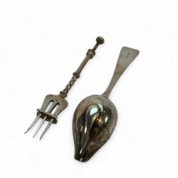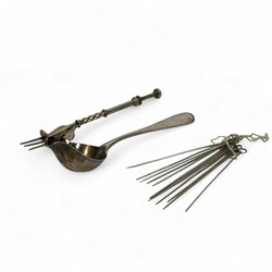 | Omschrijving | Luxeus uitgevoerde tweede gehalte zilveren vleesvork, met druk/schuifknop in het uiteinde van de steel, meester Familie J.M. van Kempen & Zonen, Voorschoten, eind 19e/eerste kwart 20e eeuw, en tweede gehalte zilveren serveerlepel met parelrand, Adrianus Pietersz. Kuijlenburg, Schoonhoven, 1882-1893, daarbij: set van twaalf tweede gehalte zilveren prikkers |