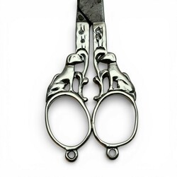 | Omschrijving | Een antieke 18e eeuwse zilveren naaischaar, met voorstelling van twee zittende honden. Gekeurd met drie andreaskruizen (Amsterdamse 18e eeuwse jaarletter), en onduidelijk meesterteken. Met latere gegraveerde tekst 'Kate 1902'. |