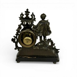 | Omschrijving | Een antiek Franse metaal legering/zamac tafelklok op een houten basement. Met een decor van een boer met zeis. Ca 1880. |