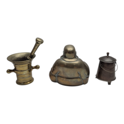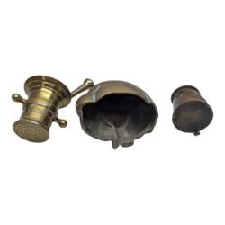 | Omschrijving | Lot divers: een bronzen vijzel met stamper, een 20e eeuwse Japanse of Chinese messing Boeddha en een koperen miniatuur doofpotje met deksel. |