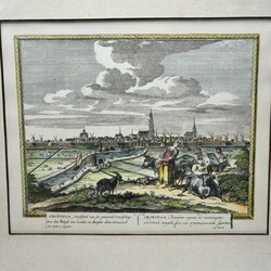 | Conditie | Coenderskaart, gebruikssporen: watervlekken, rechtsonderin enkele vouwlijntjes, ook enkele kleine plekjes bijgekleurd met potlood, gehele papier verbruind; kleinere gravures: beide goede staat, slechts roestvlekjes in passe-partout bij laatstgenoemde gravure [Groninga .. vermaard] |