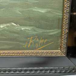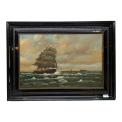 | Omschrijving | Hollandse School: scheepsportret, olieverf op multiplex, rechtsonder onduidelijk gesigneerd [J.Rïrh?], in zwartgelakte lijst |