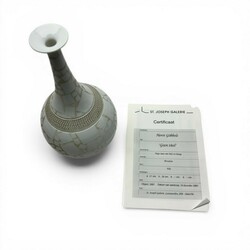 | Omschrijving | Een 20e eeuwse wit porseleinen vaas met ‘cracked ice’ patroon en sgraffito motief bij de hals. Aan de onderzijde gesigneerd Horst Göbbels (Dinslaken, 1936), ca. 2003. Met aankoopbewijs St. Joseph Galerie, Leeuwarden. |