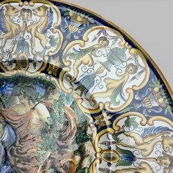 | Omschrijving | Een antieke kapitale Italiaanse majolika schotel. Polychroom met een decor van "De Triomf van Galatea" op het plat en figuren rondom op de rand. Naar een 17e eeuws voorbeeld. 19e eeuws of ouder. |