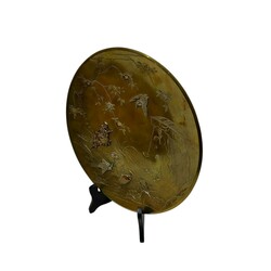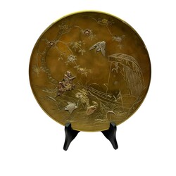 | Omschrijving | Een Japans "Damscene" bronzen mixed metalls schotel, 27 cm doorsnede. Met opgelegde decors in zilver en koper van reigers, bloemen en een rustende monnik. Meiji periode. Ca 1900. |