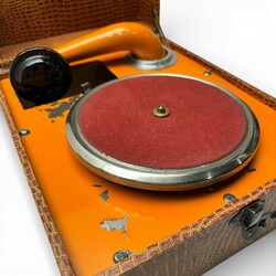 | Omschrijving | Jaren 30/40 kinder koffergramophone met bakelieten en vinylplaatjes |