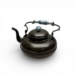 | Omschrijving | Lot diversen, waaronder een roodkoperen theestoof, Empire stijl, met geelkoperen greep en band, met antiek bruin geglazuurd aardewerken test en roodkoperen ketel met porseleinen greep en knop. Met daarbij drie theelichtjes, één wit en één groen geëmailleerd, en een groen emaille petroleumkannetje met gouden bies. |