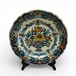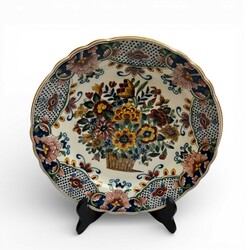 | Omschrijving | Lot van vijf 20e eeuwse aardewerken schotels, allen polychroom beschilderd en allen gemerkt Tichelaar Makkum. Onder andere twee plooischotels en twee schotels gedecoreerd met bloemenmand. |