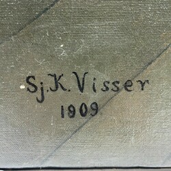 | Omschrijving | Schilderij, olieverf op doek. Herbergscene, met op voorgrond drie mannen aan tafel in gesprek met twee vrouwen. Op achtergrond een man in gesprek met twee vrouwen. linksonder gesigneerd Sj.K.Visser. |