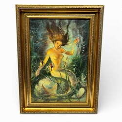 | Omschrijving | Schilderij, olieverf op doek. Voorstelling van een zeemeermin in een onderwaterdecor met vissen en waterplanten. Rechtsonder gesigneerd Sochieb (1931) |
