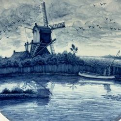 | Omschrijving | Een 20e eeuwse aardewerken wandschotel. Blauw-wit decor met voorstelling van twee vissers in een bootje bij een spinnekopmolen. Aan de achterzijde gemerkt voor Tichelaar Makkum, model 118, en tekst ‘Made in Holland’. |