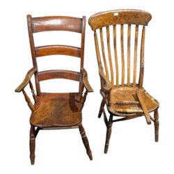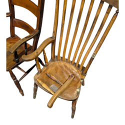 | Omschrijving | Paar houten armstoelen met gebogen rugleuning, spijlenrug en massief zadelvormig zitvlak. Traditioneel model, 20e eeuw. Update: op de kijkdagen is schade ontstaan aan één van de twee stoelen, er is een leuning afgebroken. |