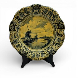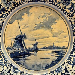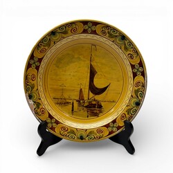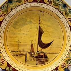 | Omschrijving | Twee aardewerken schotel. Blauw/wit en polychroom koud beschilderd met een decor van schepen op de Friese meren en molens in landschap. AKA Visser. 1 Schotel gemerkt NAW (nijverheids aterlier Workum) en andere Beide schotels beschilderd door Jan Welles (1910-2001). |