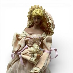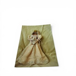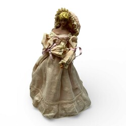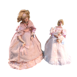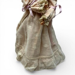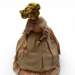| Omschrijving | Twee jaren 50/60 wassen half dolls. Gezet op framewerk en gekleed in jurken. Niet gemerkt, maar zeer waarschijnlijk Frans. |