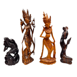 | Omschrijving | Vier Indonesische uit Djatti en teak hout gestoken sculpturen, grootste is 45 cm hoog. Voorstellingen van Javaanse danseressen met offerschalen en een Hanuman vechtend met een slang. |