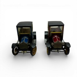 | Omschrijving | Vier Schuco blikken auto's naar jaren 20 modellen. Twee T Fords, een mercedes en een Mercer. Met opwind motoren en werkende besturing. Ca 1970. |