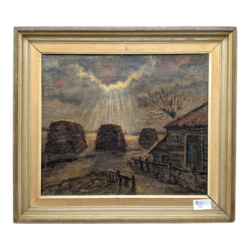 | Omschrijving | Een schilderij olieverf op doek. Oude boerderij met drie hooibulten, Met titel op de achterzijde `Siepelveen`, 1946. Gesigneerd Willy van Schoonhoven van Beurden (1883-1963). |
