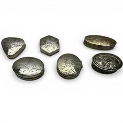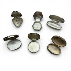 | Omschrijving | Lot met zes 1e (925/1000) en 3e (800/1000) gehalte zilveren deskeldoosjes. Verschillende vormen en modellen. |