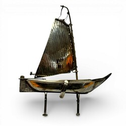 | Omschrijving | Een 20e eeuws tweede gehalte (835/1000) zilveren miniatuur zeilschip, met aan de onderzijde twee schroeven (om te monteren op een basement). Bij het roer gekeurd met lopende leeuw, minervakopje, jaarletter F (1965) en meesterteken Z/Z = Zaanlandse Zilversmederij. |
