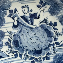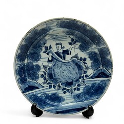 | Omschrijving | Een antiek 18e eeuws Delfts aardewerken bordje met voorstelling van een vrouw met hoorn des overvloeds. Betreft vermoedelijk Fortuna, de godin van het geluk. |