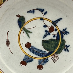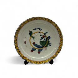 | Omschrijving | Een antiek 18e eeuws Delfts aardewerken bord, polychroom decor met voorstelling van een papegaai op een ring. Ongemerkt. |