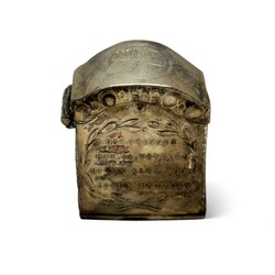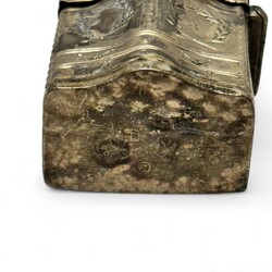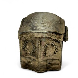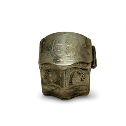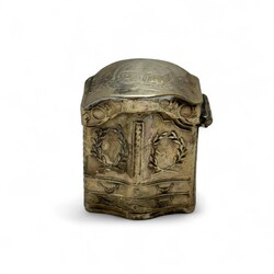 | Omschrijving | Een antiek 19e eeuws eerste gehalte (835/1000) zilveren lodereindoosje in de vorm van een kabinetje, op de achterzijde met tekst ‘dit kabinet heb ik van doen het is alweer een nieuw fatzoen’. Gekeurd met pseudokeuren, Engelse keuren (Londen, mr. I.S.M.) Nederlands meesterteken JK1 = Jacob Kooiman, Schoonhoven 1881-1893 en jaarletter C (1887) |