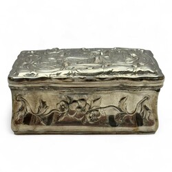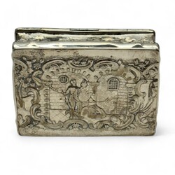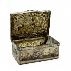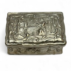 | Omschrijving | Een antieke 19e eeuwse tweede gehalte (835/1000) zilveren snuifdoos, met aan de bovenzijde een onderzijde gedreven voorstellingen, o.a. een ridder met zwaard en valk in een kasteel. |