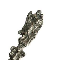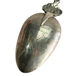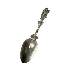 | Omschrijving | Een antieke 19e eeuwse tweede gehalte (835/1000) zilveren geboortelepel met getorste steel, bekroond met Caritas (moeder met kinderen). Op de achterzijde van de bak gegraveerd met familiewapen en inscriptie 'Pieter Anes Jukema is geboren den 26 september 1866'. Gemerkt met lopende leeuw, minervakopje, jaarletter F (1865) en onduidelijk meesterteken. |