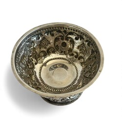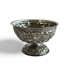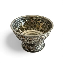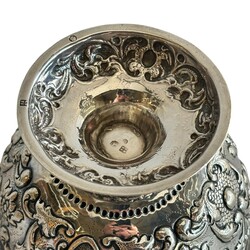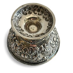 | Omschrijving | Een antieke 19e eeuwse tweede gehalte (835/1000) Fries zilveren roomkom, gegraveerd en gedreven, met aan beide kanten ruimte voor een (alliantie)wapen onder kroon. Aan de onderzijde gemerkt met lopende leeuw en meesterteken ‘AB34’ = Ate de Groot Boersma, werkzaam te Sneek van 1875 tot 1909, jaarletter A (1885) |