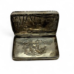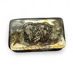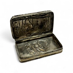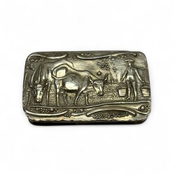| Omschrijving | Een antieke 19e eeuwse tweede gehalte (835/1000) zilveren snuifdoos, met aan de bovenzijde een voorstelling van een boer met juk en twee koeien. Gemerkt JK1 = Mr. J. Kooiman, Schoonhoven, 1881-1893, jaarletter 1891. |