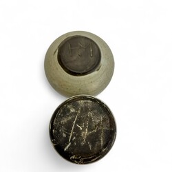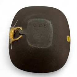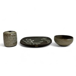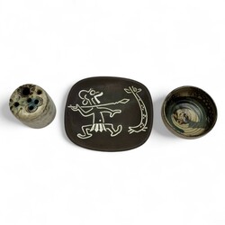 | Omschrijving | Lot van drie stuks 20e eeuws keramiek: een zwart keramieken schaaltje, voorstelling van een Afrikaan jagend op een giraf. Aan de achterzijde gemerkt Ravelli, model D-258, met origineel Ravelli stickertje. Met daarbij een bloemenvaasje en schaaltje, beide gesigneerd ‘HM’ = Hannie Mein (Utrecht 1933 - Vinkega 2003). |
