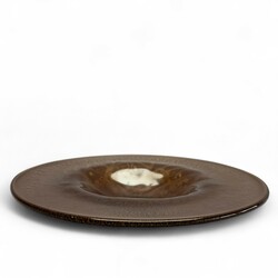| Omschrijving | Een bruin glazen schaal met tincraquelé decoraties. Serica nr 63 uit 1940/43. Ontwerp en gemerkt A.D. Copier (1901-1991) voor glasfabriek Leerdam. |