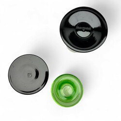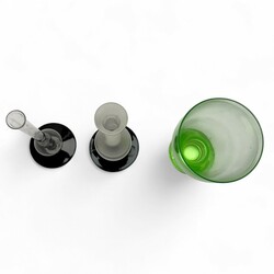 | Omschrijving | Lot van drie glazen vazen. Bestaand uit twee orchideeën vaasjes op zwarte voet een een uranium groene bekervaas. Ontwerp van A.D. Copier voor glasfabriek Leerdam. Twee exemplaren gesigneerd. Ca 1930. |