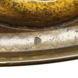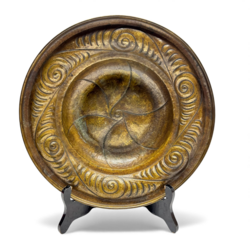 | Omschrijving | Een Amsterdamse school gepatineerd gehammerde messing sierschaal, 30 cm doorsnede. Met een gestilleerd decor van krullen op de rand en draaikolk op het plat. Gemerkt met monogram AW of WA. |