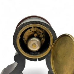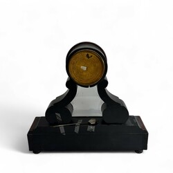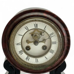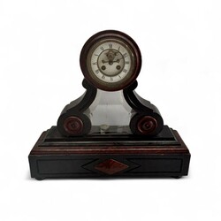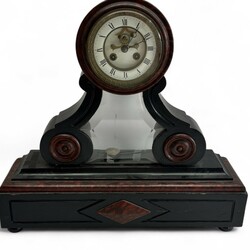 | Omschrijving | Een antieke pendule, eind 19e eeuws. Zwarthouten en gemarmerde kast, met facetgeslepen glas. Emaille wijzerplaat met Romeinse cijferaanduiding. |