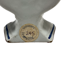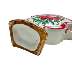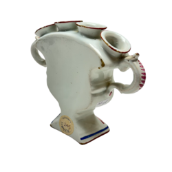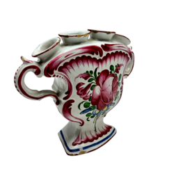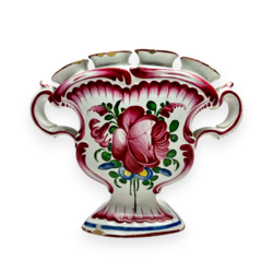 | Omschrijving | Een antieke aardewerken tulpenvaas met twee oren en vier tuiten, 15 cm hoog en 18 cm lang. Bietenrood met floraal decor. Niet gemerkt, maar toegeschreven aan Arnhemse Faience of mogelijk Strasbourgh ca 1780.Minimale randchips. Provenance: Sticker Sotheby's Lot nr 245 in veilingnummer 776. |