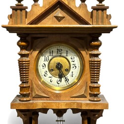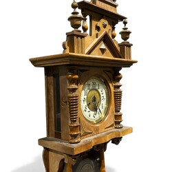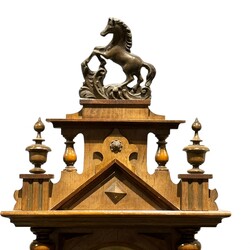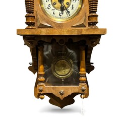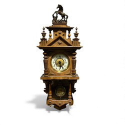 | Omschrijving | Een antieke laat 19e of vroeg 20e eeuwse Duitse vrijslinger klok, neo-renaissance, bekroond met een gestoken paard. Uurwerk gemerkt ‘G.W.’ = Gebrüder Wilde, Villingen. |