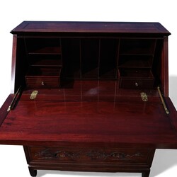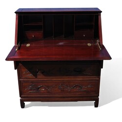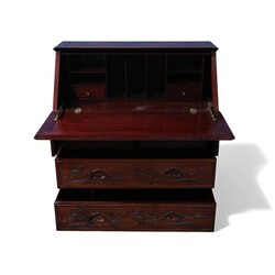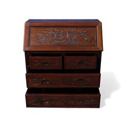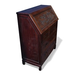 | Omschrijving | Een 20e eeuwse Chinese rozenhouten secretaire, rondom gestoken, met vier lades en diverse kleine laadjes achter de klep. |