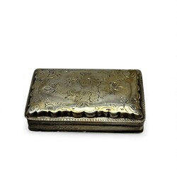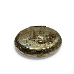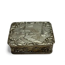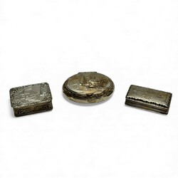 | Omschrijving | Lot van drie 19e en 20e eeuwse tweede gehalte (835/1000) zilveren snuifdoosjes. Eén ovaal model met voorstelling van een Hollands landschap, mr. DS = fa. Dahlia, Amsterdam, periode 1920-1958, één vierkant doosje met Hollands landschap, mr. HH = Hendrik Hooykaas, 1911, en één 19e eeuws langwerpig model, gegraveerd, mr. AS122 = Abraham van der Sluijs, werkzaam te Schoonhoven van 1857 tot 1881, jaarletter H (1867) |