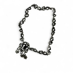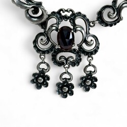 | Omschrijving | Een 20e eeuws tweede gehalte (835/1000) Duits zilveren collier met rocaillevormige schakels, centraal met ovale, gefacetteerde granaat en drie bloemvormige hangers. Gemerkt op de sluiting ‘925’ en op het oogje ‘ZII’ en zwaardje. |