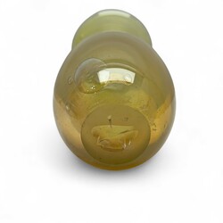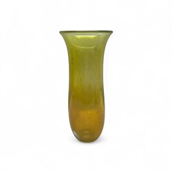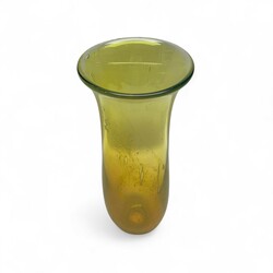 | Omschrijving | Een geel glazen designvaas met luchtbellen en trompetvormige hals. Onduidelijk gesigneerd en genummerd aan de onderzijde. |