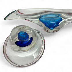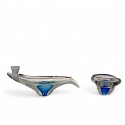 | Omschrijving | Een zwaar glazen langwerpige kandelaar en een bijpassende asbak. Dikwandig blank glas met rode rand en blauwe kern. Ontwerper onbekend. Mogelijk omgeving Murano. |