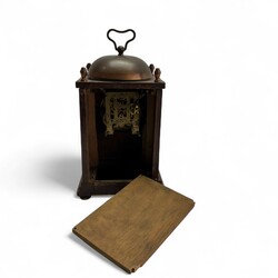 | Omschrijving | Een Engelse of Duitse houten tafelklok met messing en koperen applicaties. Arts & Crafts. Niet gemerkt. |