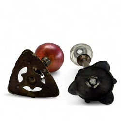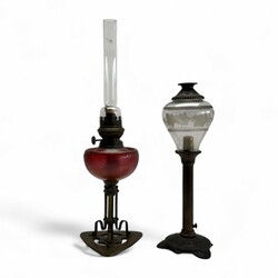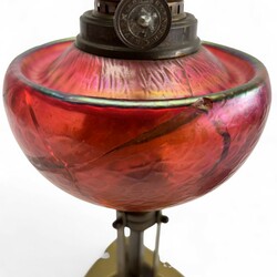 | Omschrijving | Een olielamp op een messing gestilleerde voet. Met een rood opaliserende Loetz glazen reservoire. Hierbij een messing met semac kaarsenhouder met geëtst glazen kap. Ca 1910. |