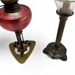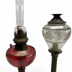 | Kavel | 1111. Een olielamp met Loetz glazen reservoire en een kaarsenhouder met geëtste glazen kap. |