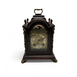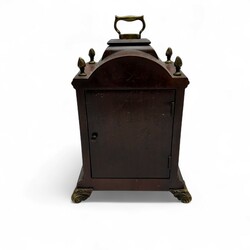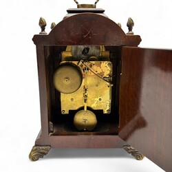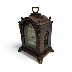 | Omschrijving | Een 20e eeuws tafelklokje in notenhouten kast. Met messing pottjes, rand versiering en greep. Gemerkt op de wijzerplaat John Smith, London. Vervaardigd door Warming, Nederland. |